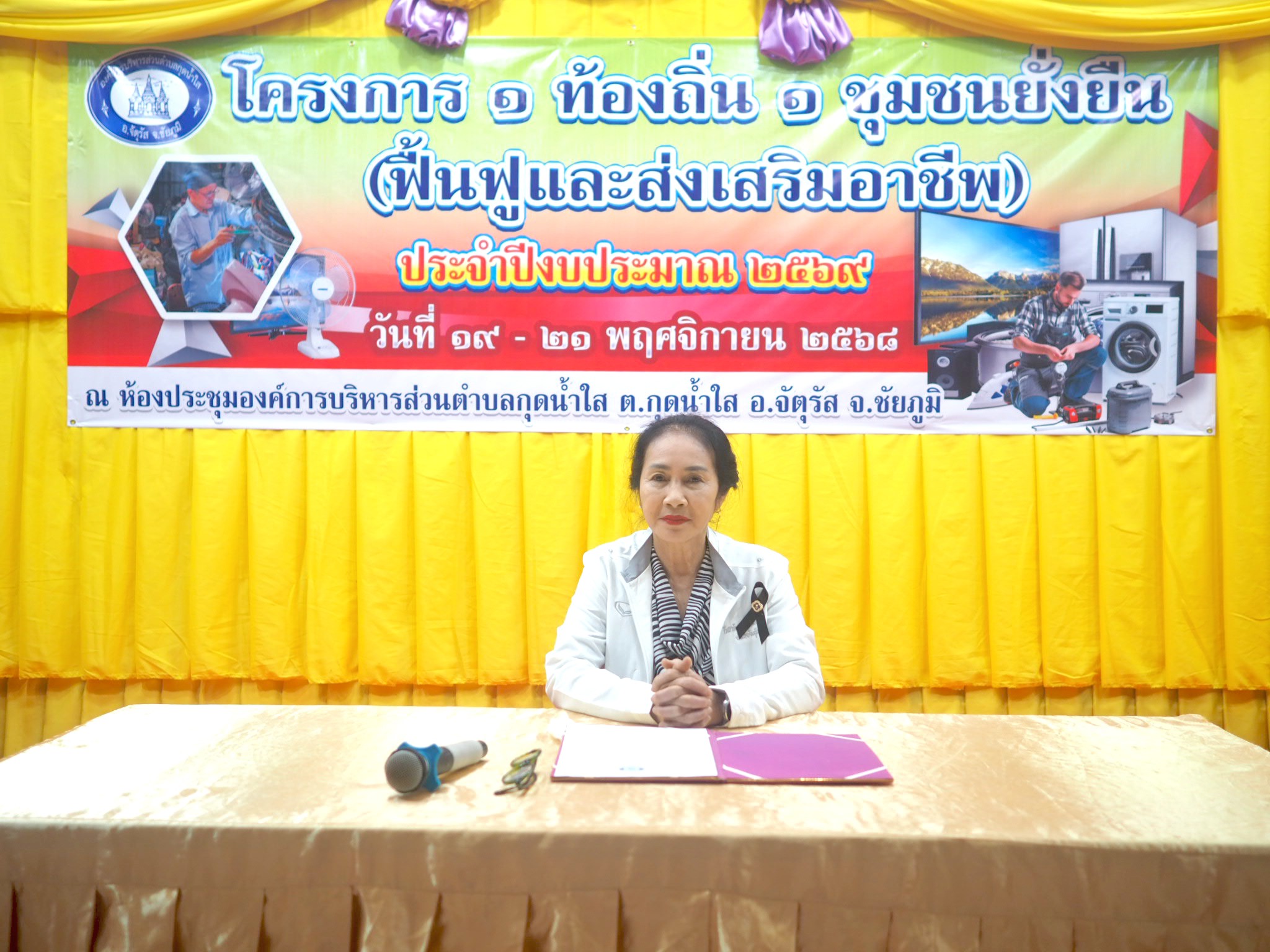 เมื่อวันพุธ ที่ 19 พฤศจิกายน 2568 เวลา 09.00 น.นางปรียา โพธิ์ชัย นายกองค์การบริหารส่วนตำบลกุดน้ำใส พร้อมคณะผู้บริหาร ปลัด หัวหน้าส่วนราชการ พนักงาน ผู้นำชุมชน 14 หมู่บ้าน อสม. หมู่ที่ 1 , หมู่ที่ 13 และสมาชิกสภาองค์การบริหารส่วนตำบลกุดน้ำใส เปิดโครงการ 1 ท้องถิ่น 1 ชุมชนยั่งยืน (ฟื้นฟูและส่งเสริมอาชีพ) ประจำปีงบประมาณ 2569 ตั้งแต่วันที่ 19-21 พฤศจิกายน 2568 ณ หอประชุมองค์การบริหารส่วนตำบลกุดน้ำใส ตำบลกุดน้ำใส อำเภอจัตุรัส จังหวัดชัยภูมิ