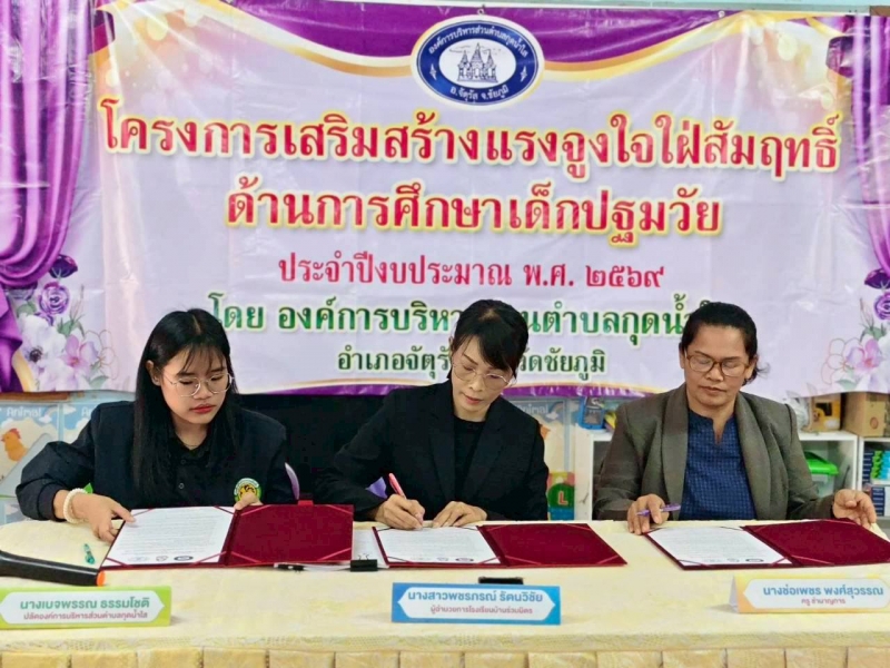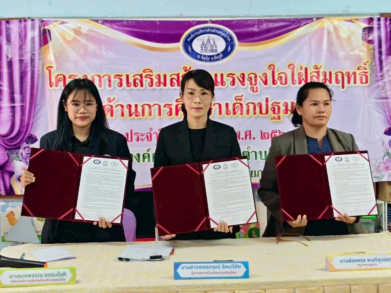 วันพฤหัสบดี ที่ 12 กุมภาพันธ์ 2569 เวลา 09.00 น.นางเบญจพรรณ ธรรมโชติ ปลัดองค์การบริหารส่วนตำบลกุดน้ำใส ได้มอบหมายให้นางสาววราภรณ์ ปิ่นสุวรรณ นักวิชาการศึกษา รักษาราชการแทนผู้อำนวยการกองการศึกษา ศาสนา และวัฒนธรรม พร้อมด้วยเจ้าหน้าที่กองการศึกษาฯ และคณะกรรมการสถานศึกษาศูนย์เด็กพัฒนาเด็กเล็กบ้านร่วมมิตร เปิดโครงการเสริมสร้างแรงจูงใจใฝ่สัมฤทธิ์ด้านการศึกษาเด็กปฐมวัย ประจำปีงบประมาณ พ.ศ.2569